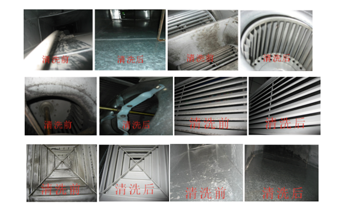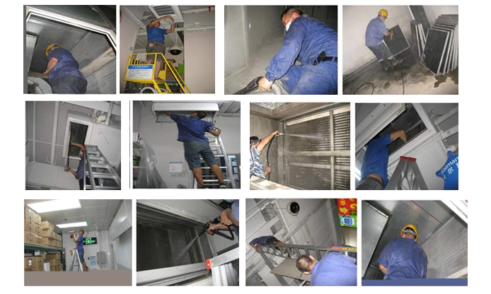 長沙某大型超市中央空調(diào)公共區(qū)域采用“水冷機組+空氣處理機”的全空氣處理系統(tǒng),共有空氣處理機19臺,局部區(qū)域如員工辦公室、檔案室等采用風機盤管,共有風機盤管26臺。中央空調(diào)投入使用已3年多,甲方委托我司對風系統(tǒng)進行清洗保養(yǎng)服務,此次共清洗空氣處理機19臺、風機盤管26臺,清洗風管約7500平米(展開面積),清洗空調(diào)風口300多個。以下為清洗實施方案: