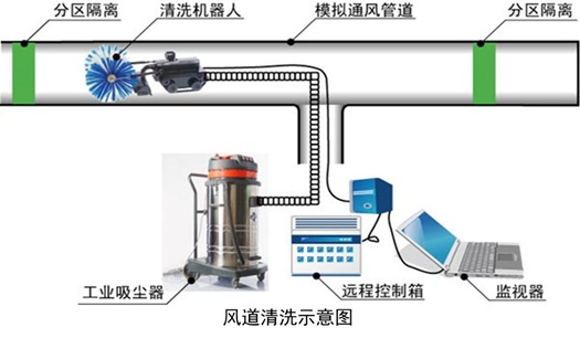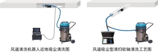 (3)在狹小的風道內(nèi),清掃機器人體積過大進不去,就要使用吸塵型軟軸做清掃揚塵,并同時進行吸塵處理(清掃支風道)。