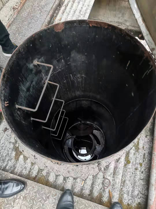 4) 排水后應打開油罐上人孔蓋板,在罐頂人孔處用防爆風機連接軟風管對罐內空氣進行強制性換空。油氣換空后再次用氣體檢測儀檢測罐內油氣濃度,達標后(爆炸下限的40%,柴油的爆炸下限為0.6%,達標濃度為0.24%以下)將吸附在罐壁、罐底上的殘留油污用高壓泡沫水沖洗干凈。