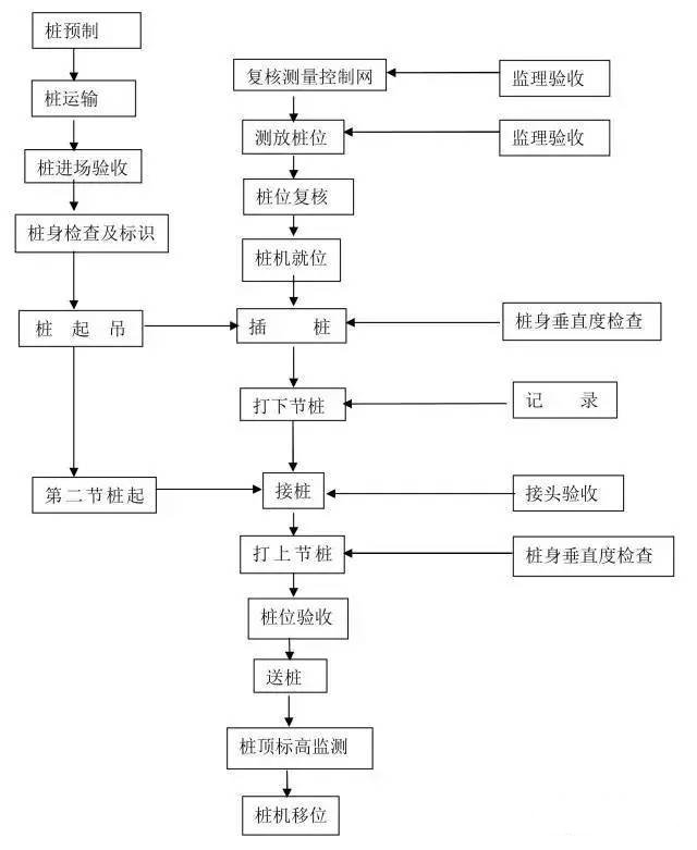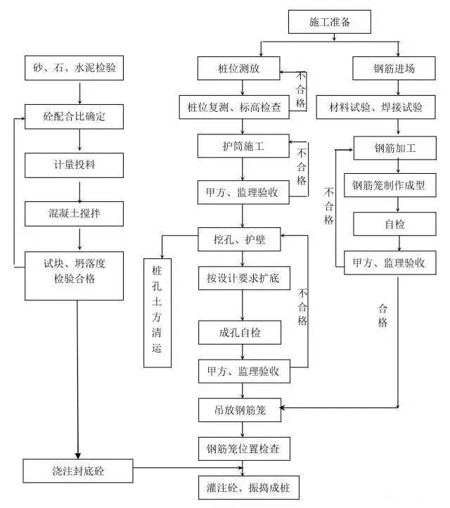 樁基是壹種古老的基礎型式。樁工技術歷經了幾千年的發展過程。無論是樁基材料和樁類型,還是樁工機械和施工方法等都有了巨大的發展,已形成了現代化基礎工程體系。在有些情況下,采用樁基能大量減少施工現場工作量與材料之消耗。由于樁基種類繁多,施工工藝差異大,在此總結整理十四種樁基施工流程圖,僅供對比參考之用。