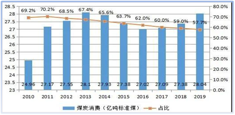 國家能源發展十三五規劃:到2020年,能源消耗總量控制在50億噸標準煤以內。2019年全國煤炭消費量約28.04億噸標準煤,煤炭消費量占能源消費總量的57.7%。