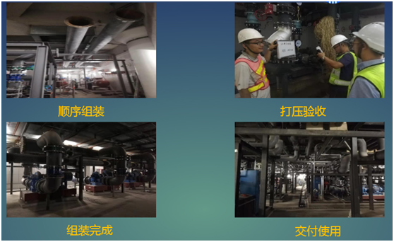 制冷機房BIM+工廠預制化裝配式施工,采用工廠流水線化預制加工工藝,代替傳統的工人現場制作,實行工廠預制、現場裝配,在預制加工廠集中進行文明施工和安全管理,減少發生安全事故的不確定因素,現場施工垃圾減少80%,現場裝配工序更加程序化、標準化、簡單化,避免長時間高強度的高空作業和交叉施工,減少發生生產安全事故的概率,并且完美實現了場內“零焊接”的綠色環保作業,全面提高了生產效率和施工質量。