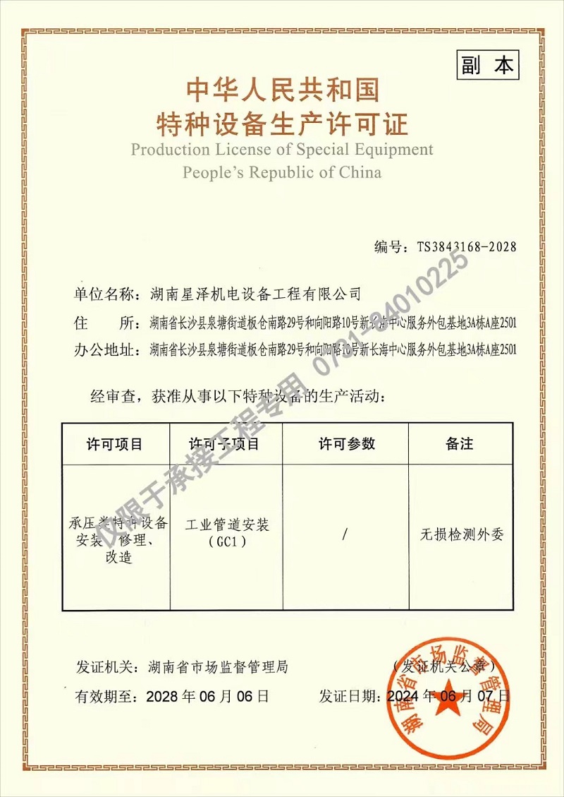 熱烈祝賀湖南星澤 機電設備工程公司取得工業管道安裝GC1最高資質!成績來之不易,感謝省市縣市場監督特種設備行政管理部門和協會給予星澤大力支持,感謝星澤全體員工團結拼搏,不畏艱難,敬業奉獻的忘我工作。我們要珍惜、愛護企業的核心成果,在項目管理中始終以謙卑之心,求真務實,精益求精的職業責任感和神圣使命感,強化TSGD0001-2009《壓力管道安全技術監察規程》為基本準則指導,把《特種設備生產單位落實質量安全主體責任監督管理規定》認真落實到質量安全體系運行中、確保項目質量安全,滿足客戶需求,努力建設星澤著名品牌,鑄造星澤行業標桿。