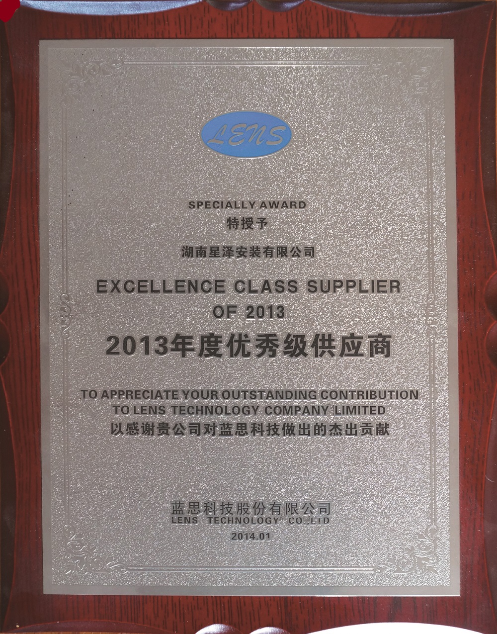 藍思科技授予湖南星澤安裝有限公司 “2013年度優秀級供應商”以感謝我公司對藍思科技做出的杰出貢獻。